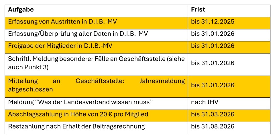 gemeldet werden und dürfen nicht seitens der Imkervereine in der D.I.B.-MV vorgenommen werden. Dieses muss in einem speziellen Meldeformular D.I.B.-MV „Meldungen an den Landesverband zur D.I.B.-MV“) schriftlich der Geschäftsstelle mitgeteilt werden. Sollte die Jahresmeldung (erfolgt durch Freigabe der Mitglieder in der D.I.B.-MV) nicht bis zum 31.01.2026 in der Geschäftsstelle vorliegen, wird die Jahresmeldung 2025 zu Grunde gelegt (die Freigabe erfolgt dann durch die Geschäftsstelle – ausgenommen erfasste Austritte) und eine Änderung ist grundsätzlich nicht mehr möglich. Die Nachmeldung von Neumitgliedern im lfd. Jahr ist hiervon nicht betroffen. Bitte teilen Sie uns kurz schriftlich mit (E-Mail an die Geschäftsstelle), sobald Ihr Verein die Jahresmeldung in der D.I.B.-MV abgeschlossen hat.